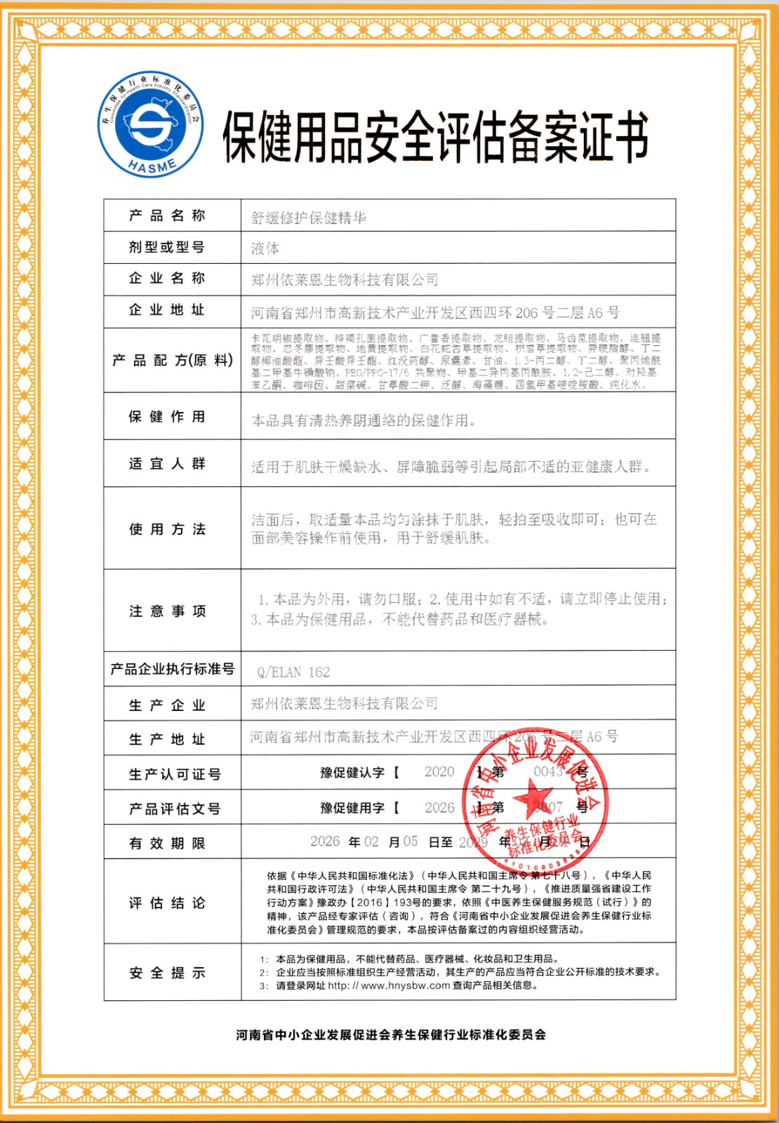 | 标准名称 | 舒缓修护保健精华 | 标准编号 | Q/ELAN 162-2026 |