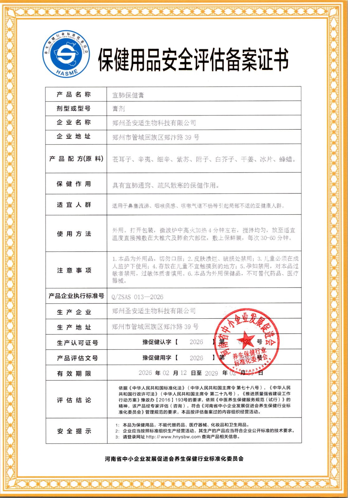 | 查看文本 | 宣肺保健膏.pdf | 保健用品安全评估(咨询)意见: | 宣肺保健膏.jpg |