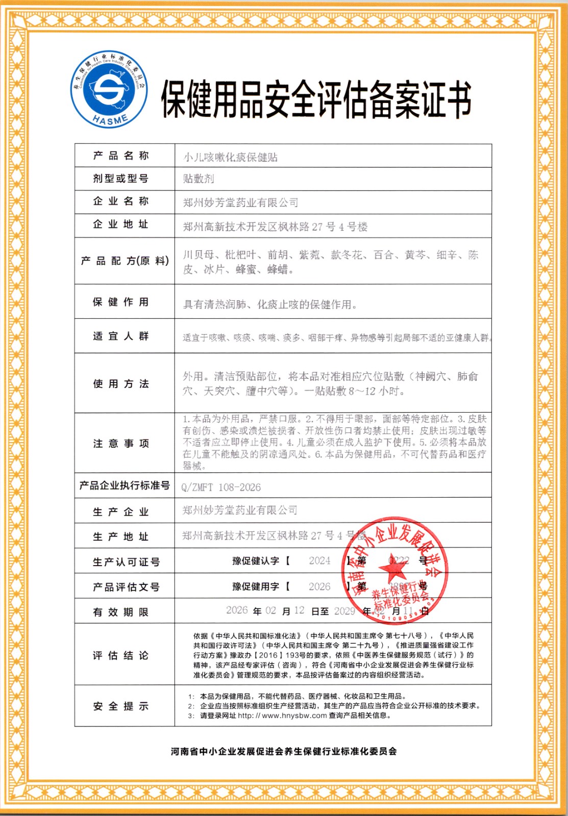 | 标准名称 | 小儿咳嗽化痰保健贴 | 标准编号 | Q/ZMFT 108-2026 |