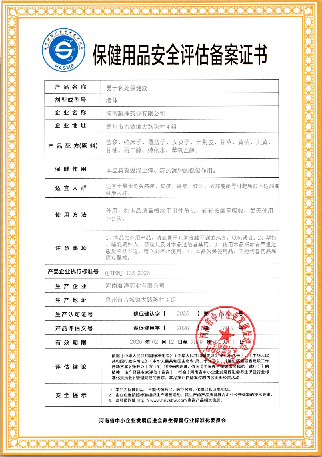 | 标准名称 | 男士私处保健液 | 标准编号 | Q/HNNJ 135-2026 |