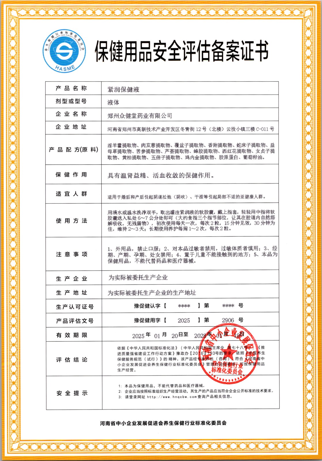 | 查看文本 | 004紧润保健液标准20250113.pdf | 保健用品安全评估(咨询)意见: | 紧润保健液.jpg |
