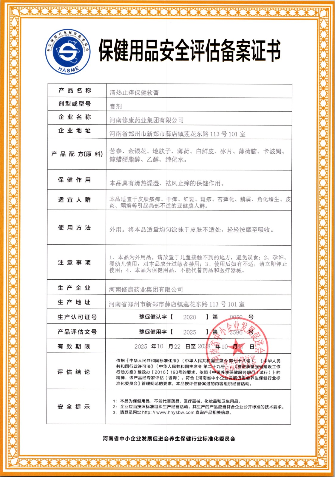 | 查看文本 | 1580-2025清热止痒保健软膏企业标准.pdf | 保健用品安全评估(咨询)意见: | 3596清热止痒保健软膏.jpg |