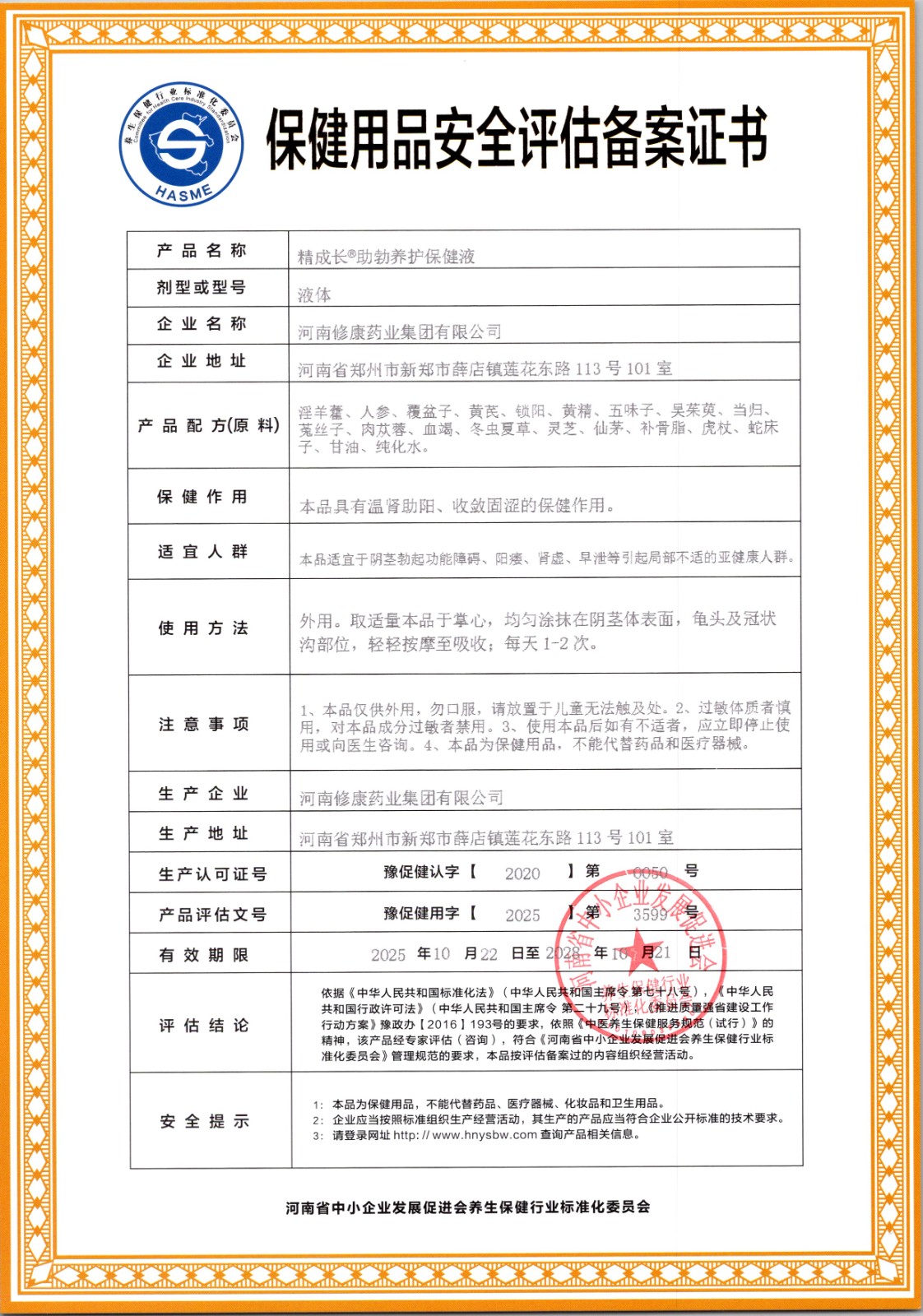 | 查看文本 | 1584-2025精成长®助勃养护保健液企业标准.pdf | 保健用品安全评估(咨询)意见: | 3599精成长®助勃养护保健液.jpg |