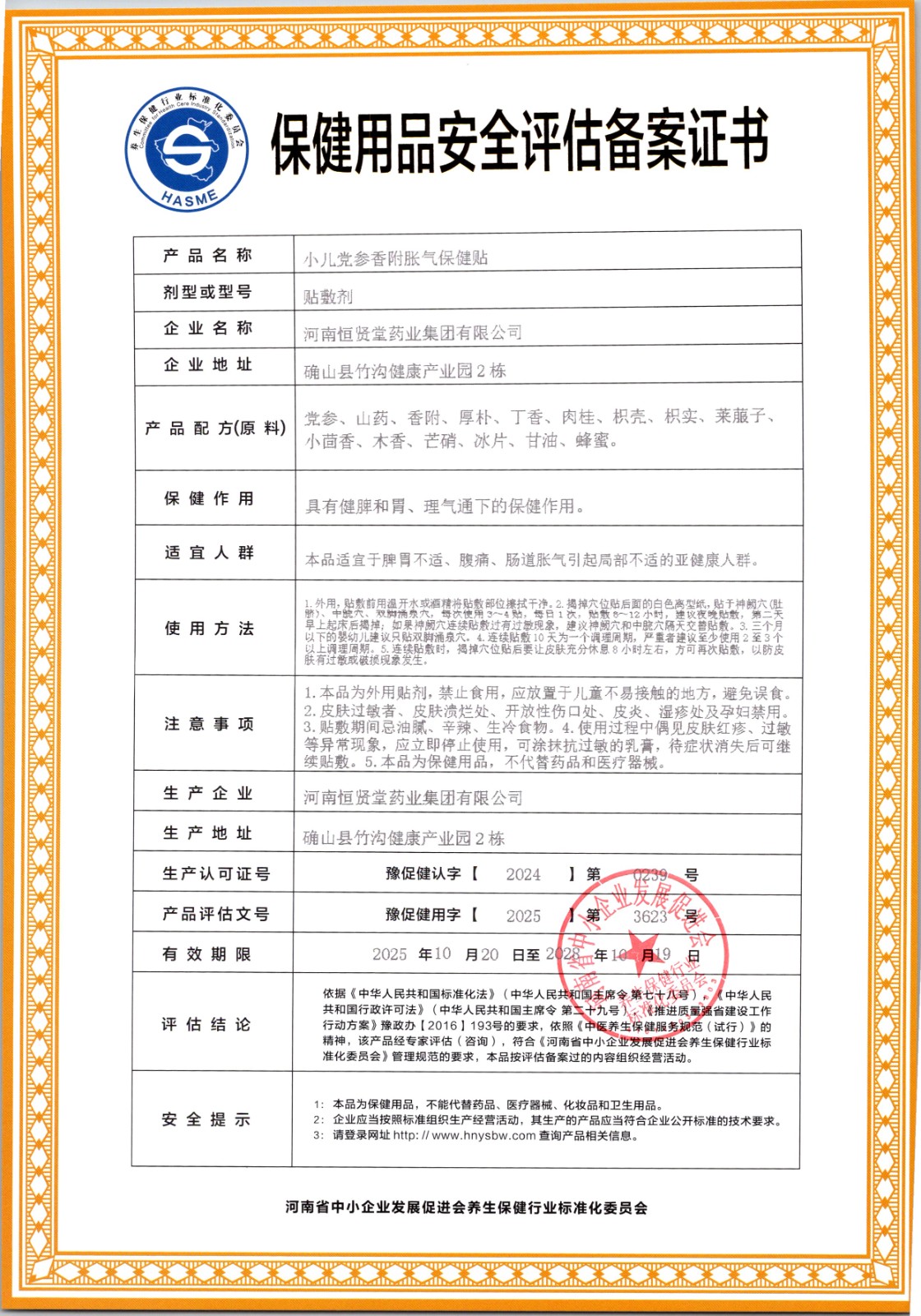 | 查看文本 | detail (6).pdf | 保健用品安全评估(咨询)意见: | 小儿党参香附胀气保健贴.jpg |