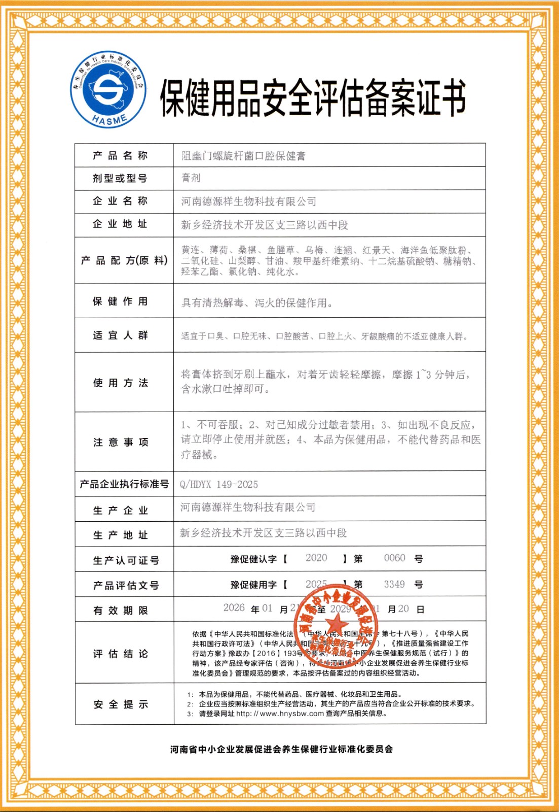 | 标准名称 | 阻幽门螺旋杆菌口腔保健膏 | 标准编号 | Q/HDYX 149-2025 |