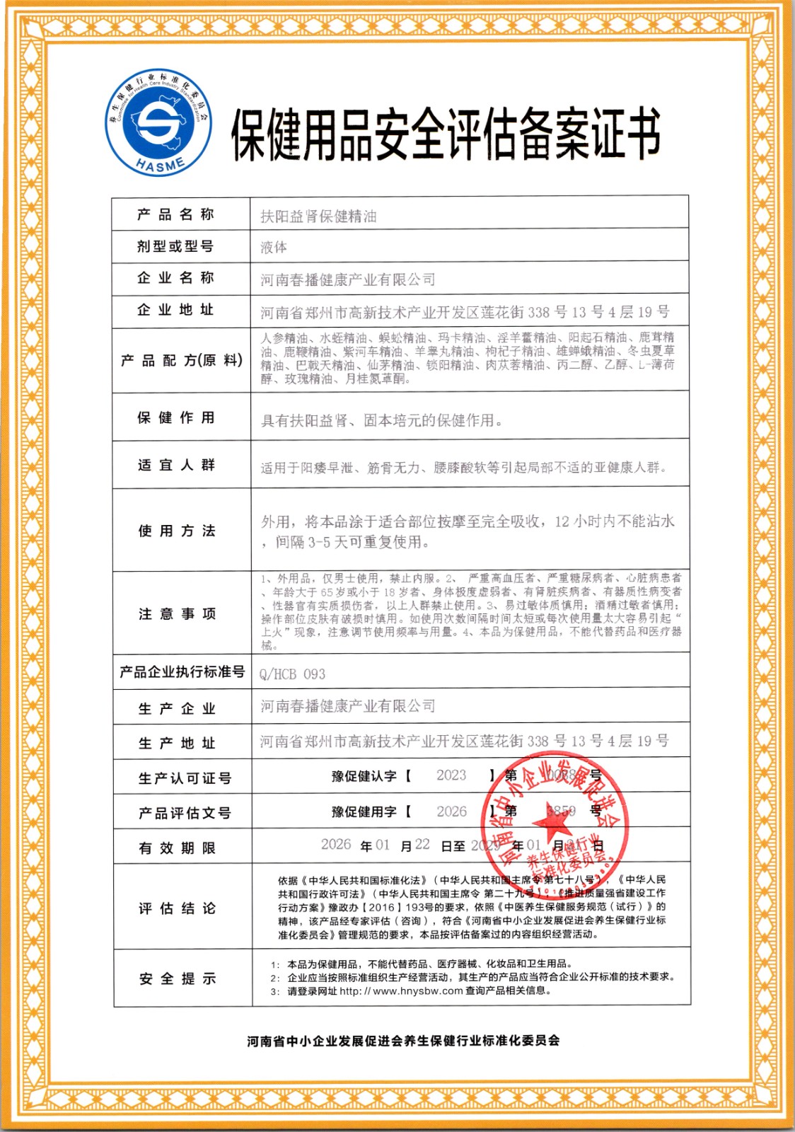 | 查看文本 | 扶阳益肾保健精油企业标准.pdf | 保健用品安全评估(咨询)意见: | 扶阳益肾保健精油.jpg |