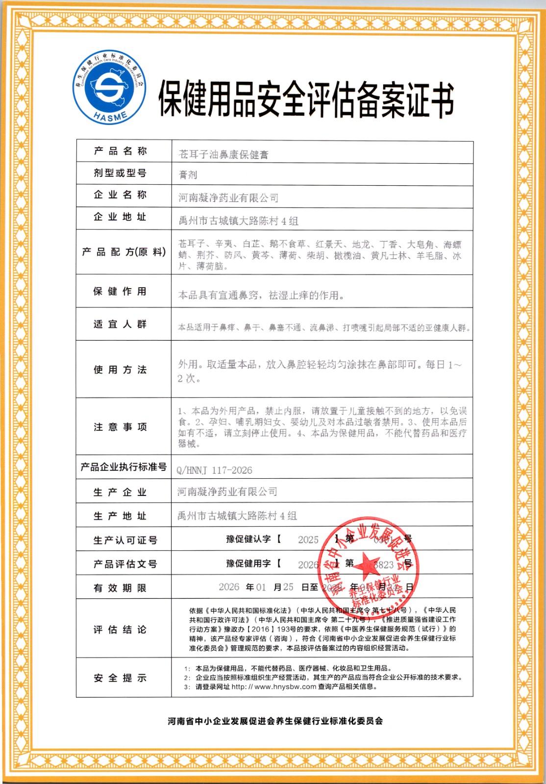 | 标准名称 | 苍耳子油鼻康保健膏 | 标准编号 | Q/HNNJ 117-2026 |