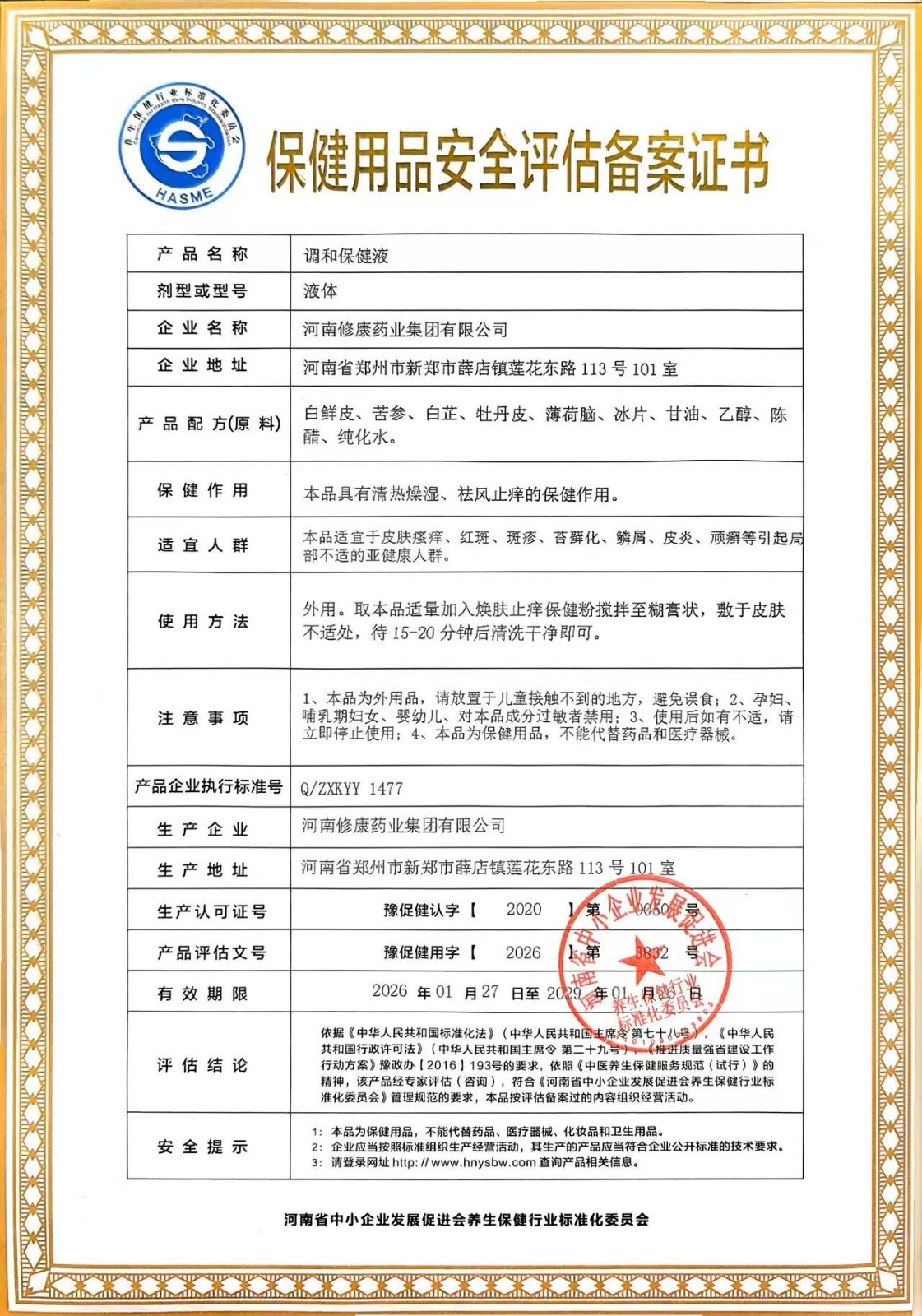 | 查看文本 | 1477-2026调和保健液企业标准.pdf | 保健用品安全评估(咨询)意见: | 3832调和保健液.jpg |