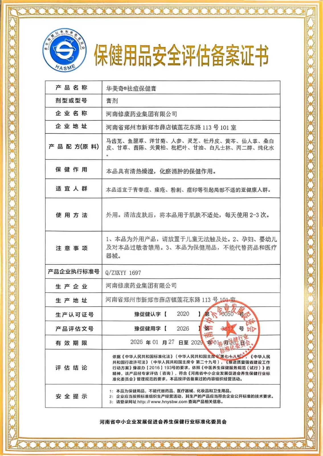 | 查看文本 | 1697-2026华美奇®祛痘保健膏企业标准.pdf | 保健用品安全评估(咨询)意见: | 3817华美奇®祛痘保健膏.jpg |