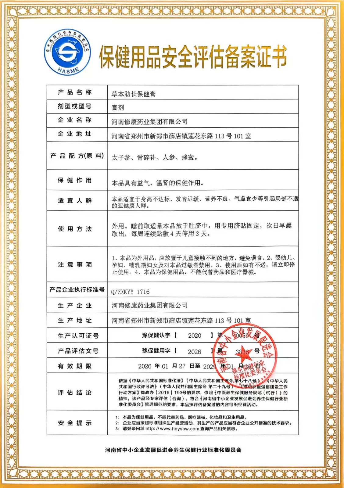 | 查看文本 | 1716-2026草本助长保健膏企业标准.pdf | 保健用品安全评估(咨询)意见: | 3836草本助长保健膏.jpg |