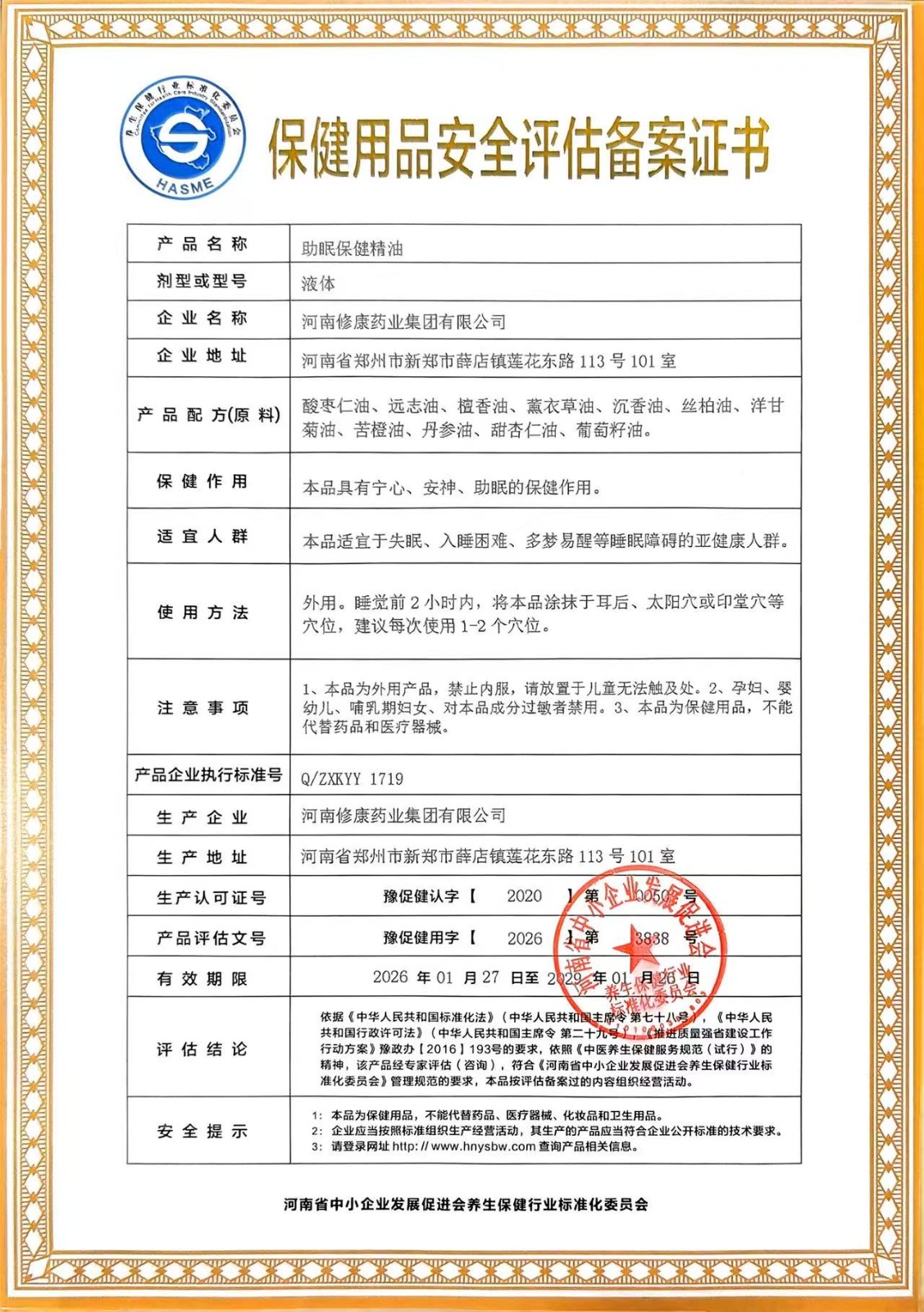 | 查看文本 | 1719-2026助眠保健精油企业标准.pdf | 保健用品安全评估(咨询)意见: | 3838助眠保健精油.jpg |