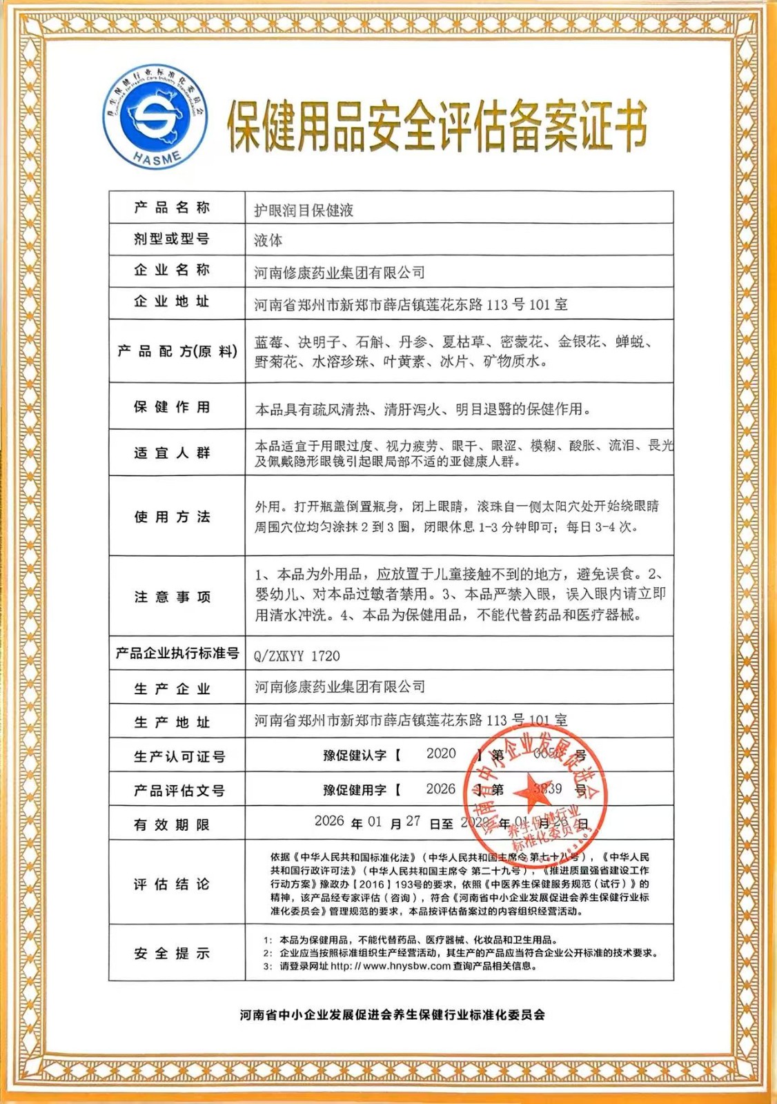 | 查看文本 | 1720-2026护眼润目保健液企业标准.pdf | 保健用品安全评估(咨询)意见: | 3839护眼润目保健液.jpg |