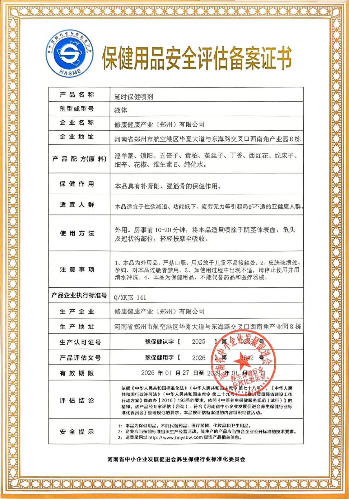 | 查看文本 | XKJK 141-2026延时保健喷剂企业标准.pdf | 保健用品安全评估(咨询)意见: | 3842延时保健喷剂.jpg |