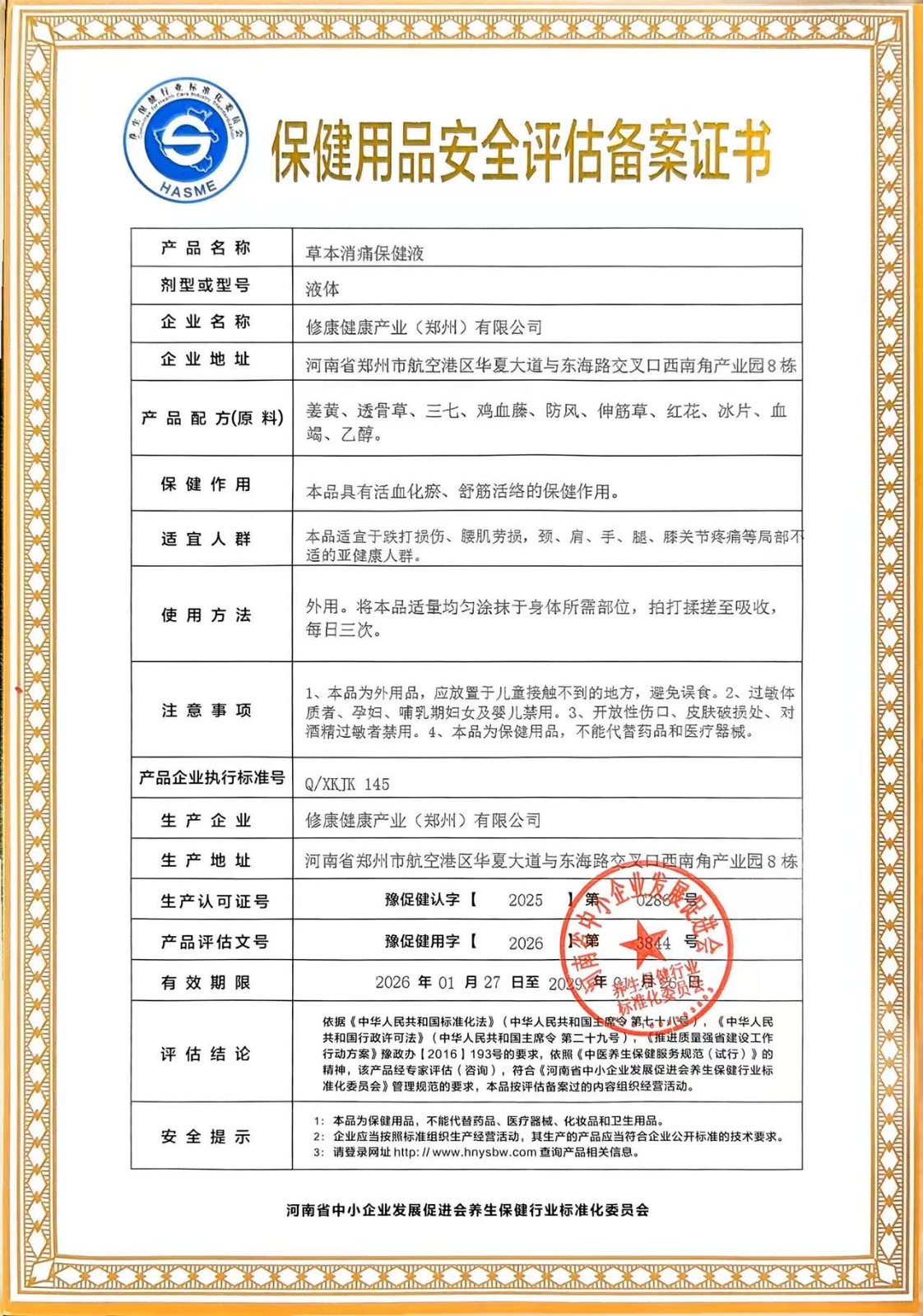 | 查看文本 | XKJK 145-2026草本消痛保健液企业标准.pdf | 保健用品安全评估(咨询)意见: | 3844草本消痛保健液.jpg |