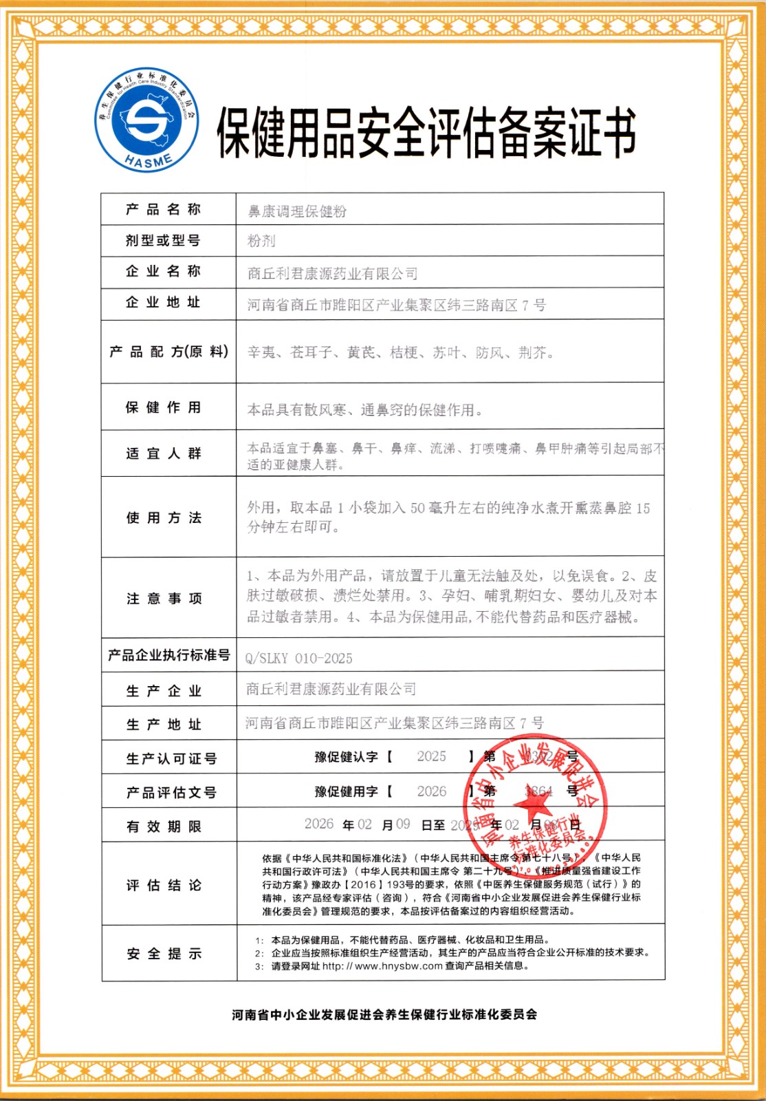 | 标准名称 | 鼻康调理保健粉 | 标准编号 | Q/SLKY 010-2025 |