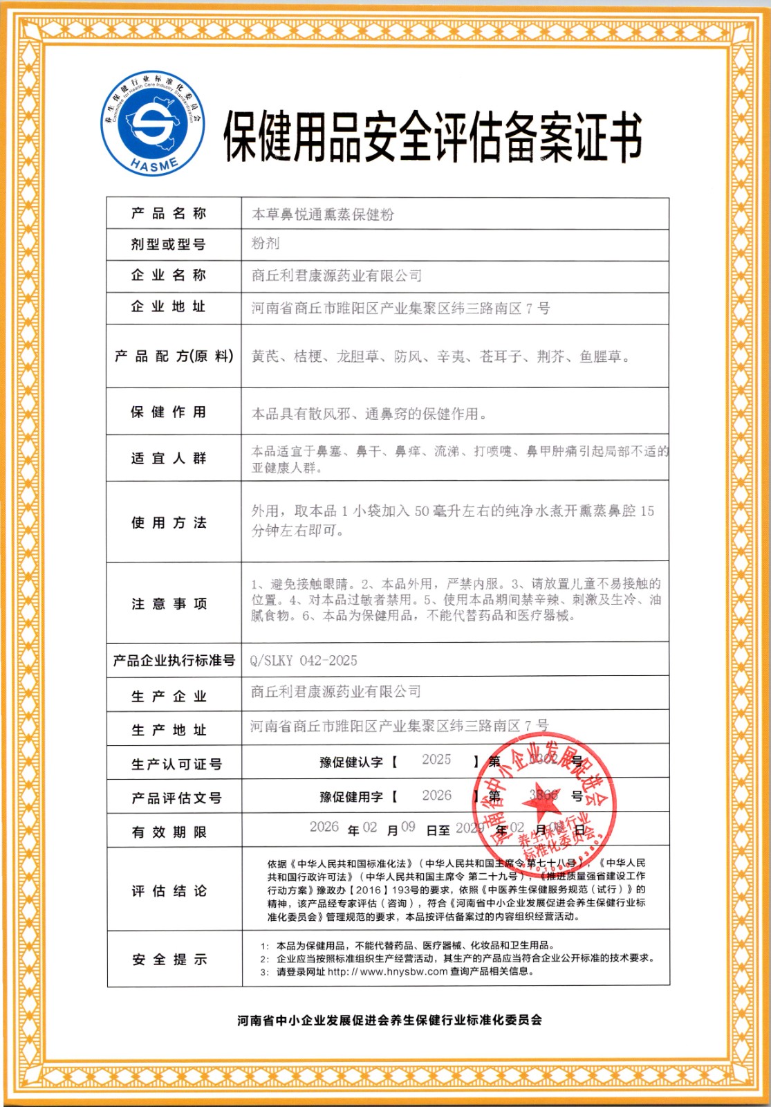 | 查看文本 | 标--042-本草鼻悦通熏蒸保健粉.PDF | 保健用品安全评估(咨询)意见: | 本草鼻悦通熏蒸保健粉.jpg |